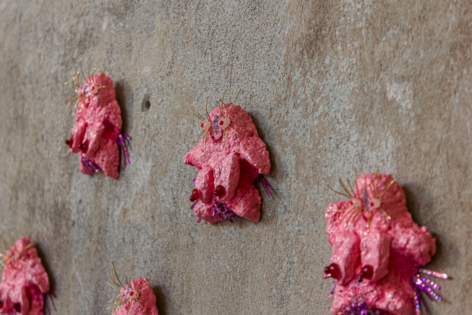 Found materials: paper mache, acrylic paint, indian ink, metal wire, christmas decoration, glue, spirulina, nail polish, food coloring